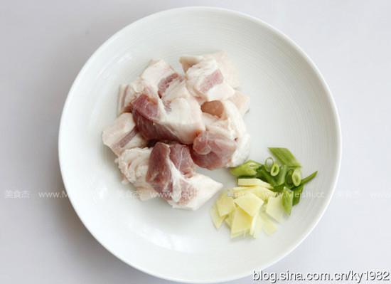 1.五花肉洗凈后切成3厘米見方的塊兒,蔥姜改刀切小