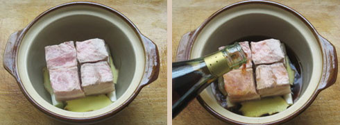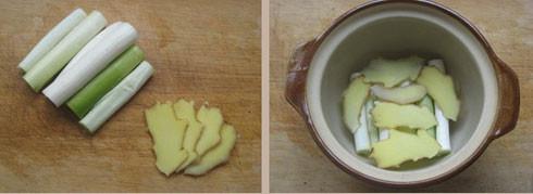 2.將大蔥切成長段,姜切片,分別墊入砂鍋底部防止肉皮粘鍋,將五花肉肉皮朝下碼放在砂鍋里