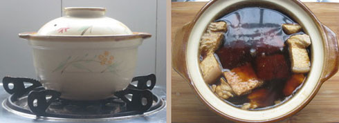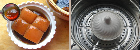 4.將五花肉從砂鍋取出,肉皮朝上放入一個帶蓋的燉盅內,把砂鍋里剩余的湯汁舀入燉盅內,蓋上蓋子入鍋大火蒸20分鐘