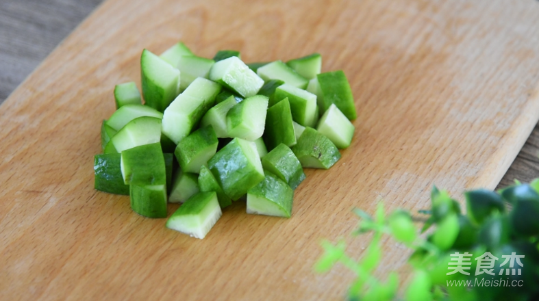 浸泡后的海蜇皮瀝水放入碗中,再倒入黑木耳、黃瓜丁