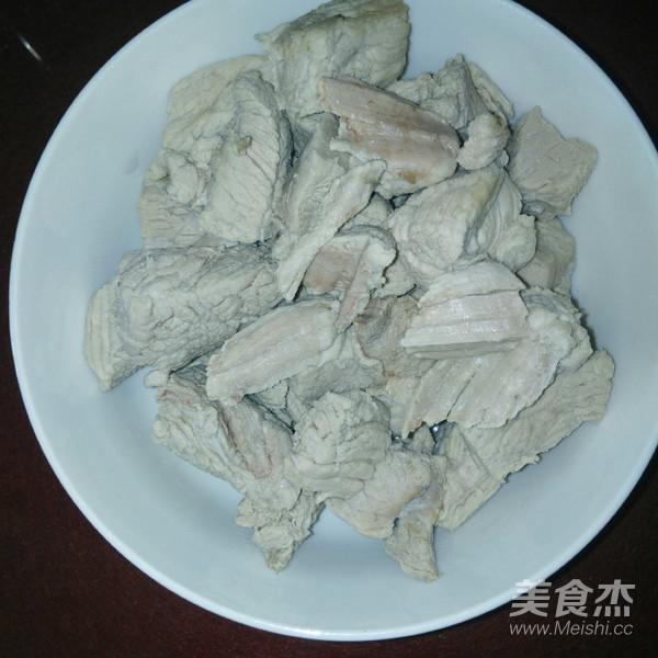 1.瘦肉去筋膜和肥肉,留下純瘦肉750克,洗凈切麻將大小焯水。