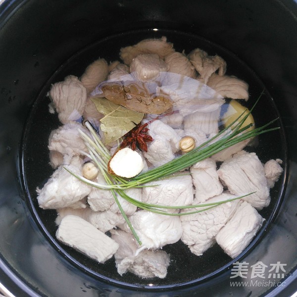 2.將肉放高壓鍋,加鹽,料酒,姜片,大料,蔥,壓50分鐘。