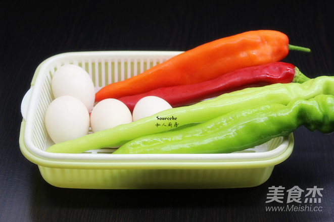 準備食材:土雞蛋、紅辣椒、青辣椒、香蔥等食材;