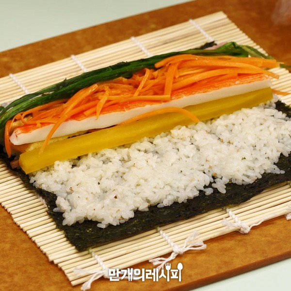 在紫菜腳上鋪上紫菜,放入米飯和整理好的材料,做紫菜包飯