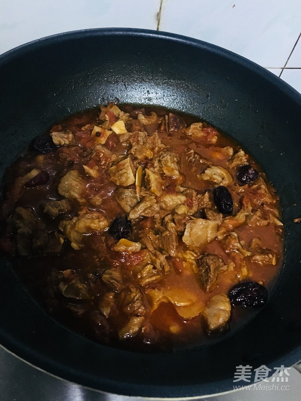 10.將牛肉和西紅柿混合,加入之前煮牛肉的湯汁。繼續燉。