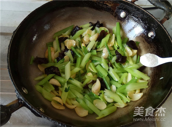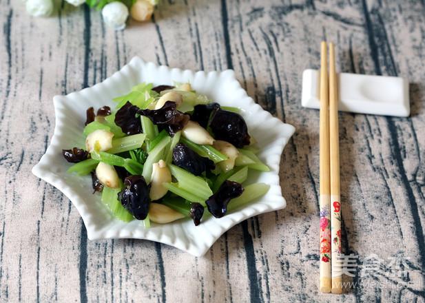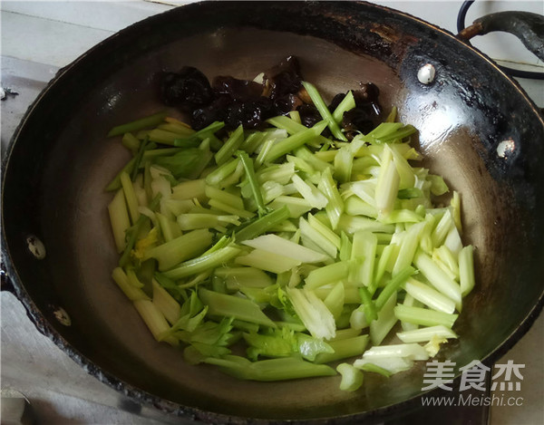 摘去西芹兩邊的筋洗凈,切成較薄的2厘米的斜段。
