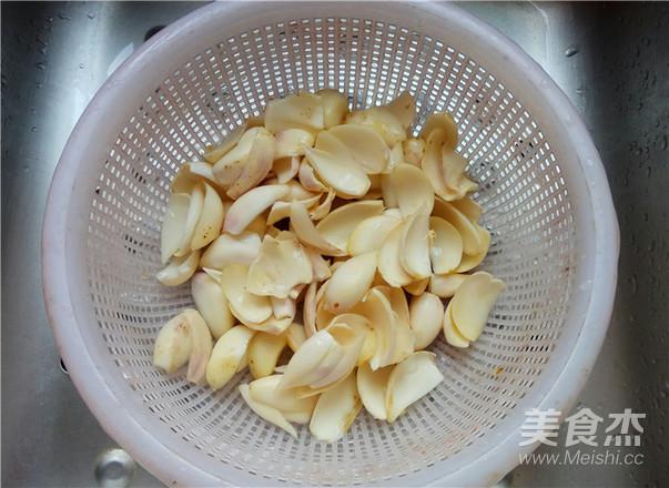 將百合兩頭黑色的部分切去,掰成片洗凈。