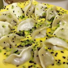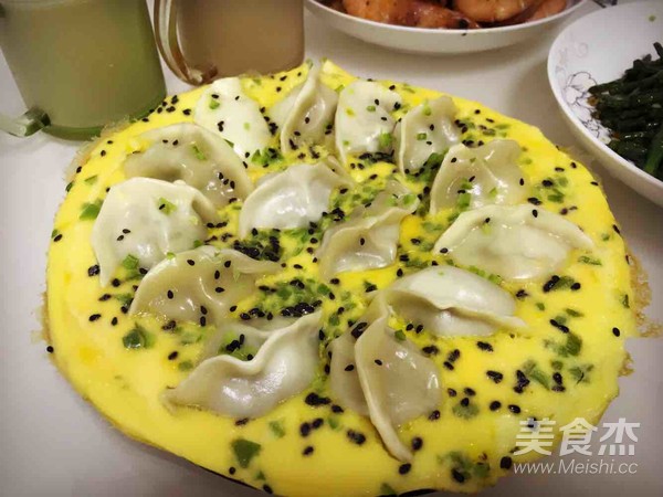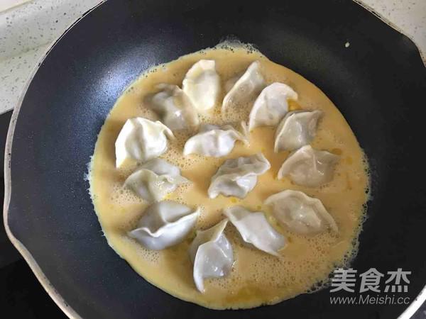 將打好的雞蛋液倒入鍋中,蓋鍋小火繼續煎至蛋液凝固。(蛋液里可以加少許鹽,依個人口味而定,我偏清淡沒加鹽,餃子本身有咸淡味,或者出鍋食用時蘸料食用)
