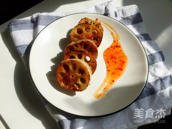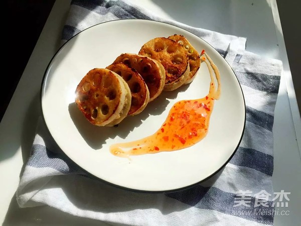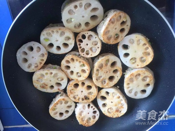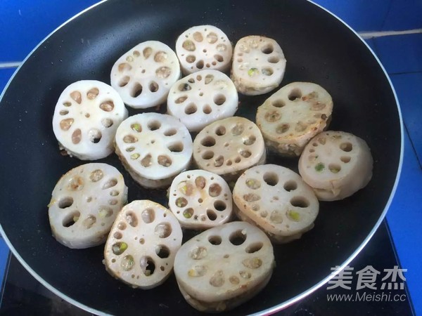 平底鍋內倒入適量的油,把做好的藕盒放入,小火煎到一面金黃,再翻另一面煎到金黃就可以