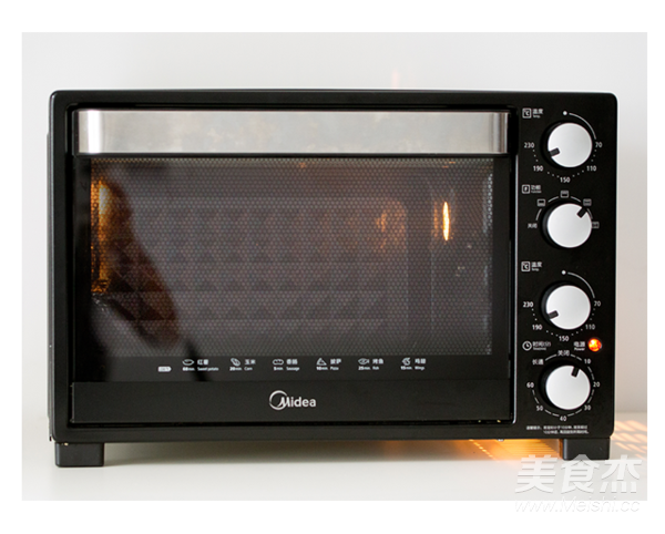 溫度設(shè)置為200℃,上下管、烤30分鐘。滿15分鐘翻轉(zhuǎn)一次,翻轉(zhuǎn)的時(shí)候在肉的表面再鋪上梨蓉