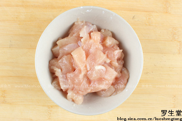 1.雞胸肉切1厘米左右大丁,用5克黃酒,少許鹽抓勻,再放少許蛋清和淀粉抓粘就腌好了