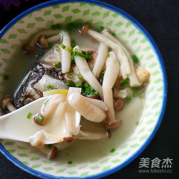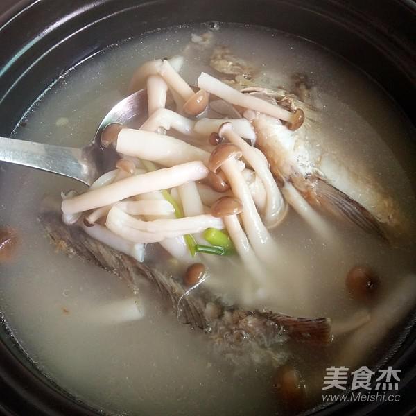 五分鐘過后可以看到鯽魚湯已成奶白色,這時把準備好的鮮菇蔥段,放入湯中再煮五分鐘
