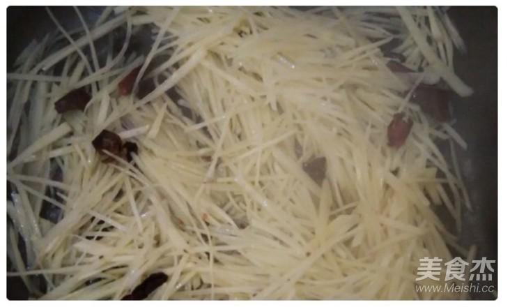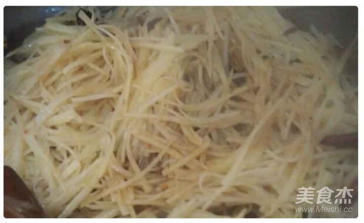 辣椒微黑了,立刻倒入土豆絲,翻炒三分鐘左右,差不多軟了