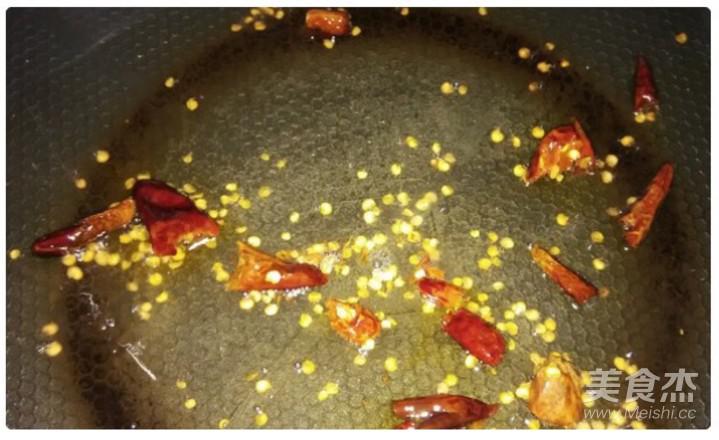 鍋里放花生油,熱鍋爆辣椒,等辣椒微黑就可以了