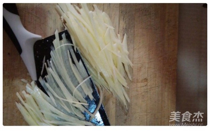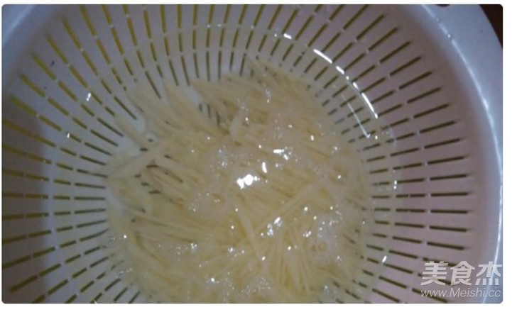 將切好的土豆絲放在一盆涼水里泡10分鐘左右,這樣炒出來更佳清脆