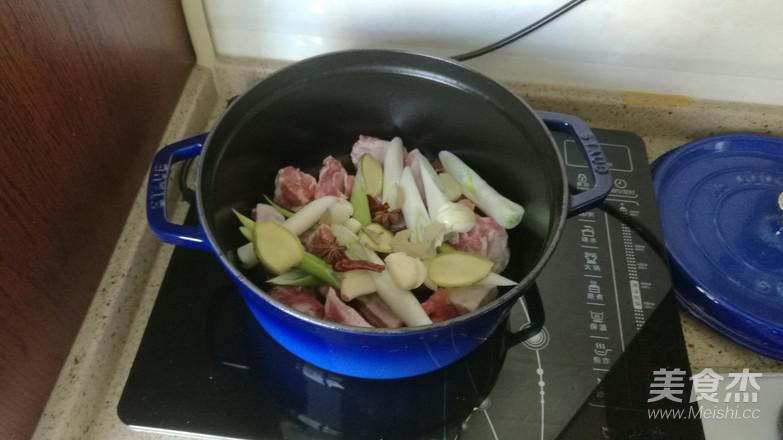 加入蔥段、姜片、八角、香葉、辣椒和冰糖