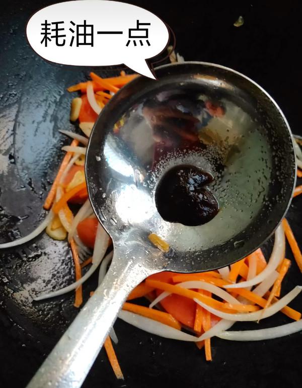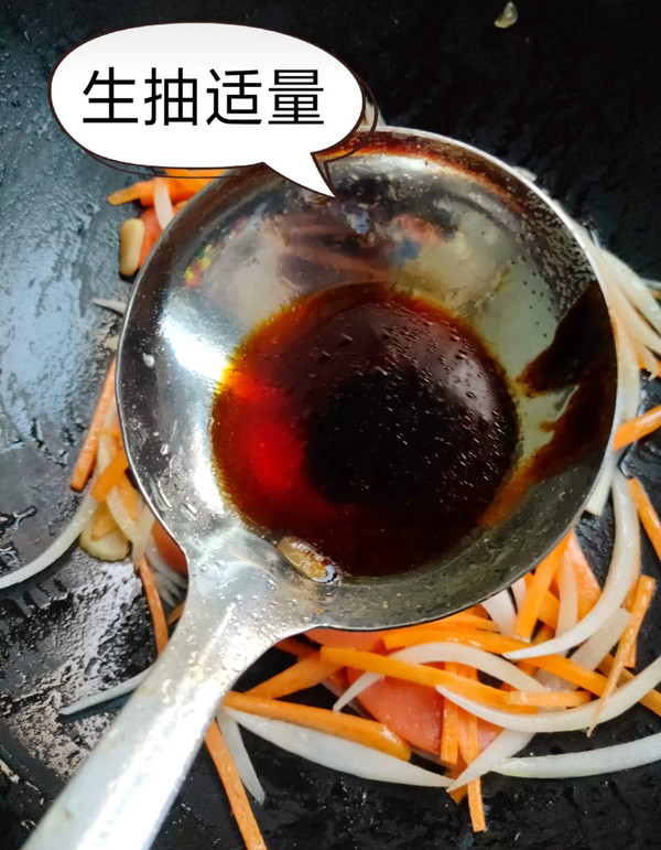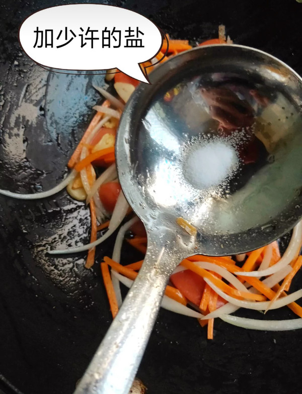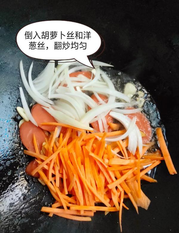 6.然后倒入胡蘿卜絲和洋蔥絲,翻炒兩分鐘,如下圖所示。