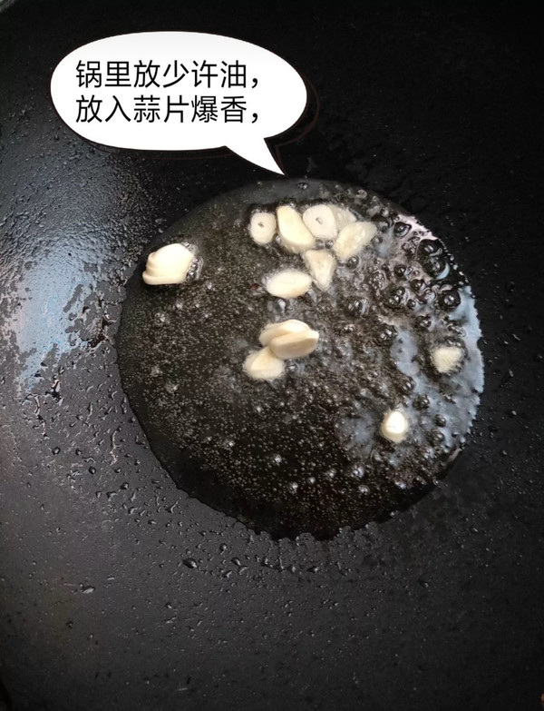 4.然后鍋中放入適量的食用油,待油冒煙,倒入蒜片爆香,如下圖所示。