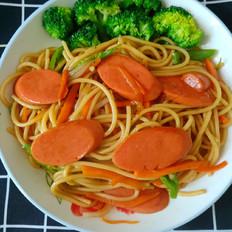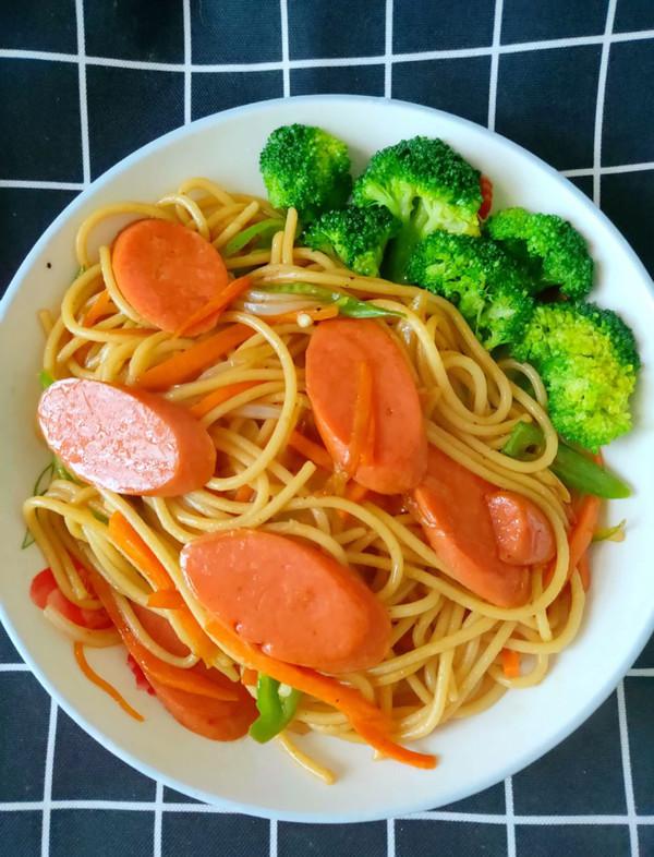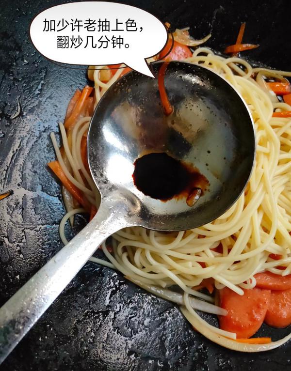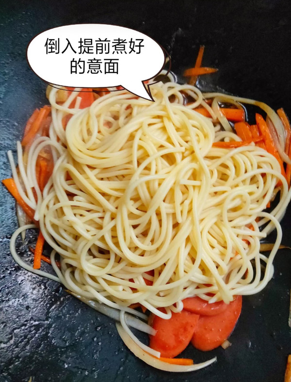 10.然后倒入事先煮好的意面,翻炒三分鐘,如下圖所示。
