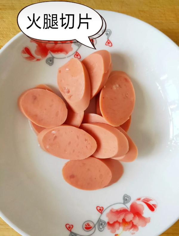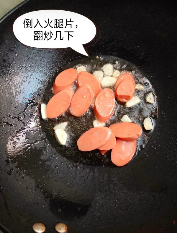 5.接著倒入火腿片翻炒兩分鐘,如下圖所示。