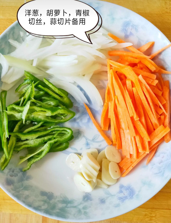 1.首先將洋蔥、胡蘿卜和青椒切成絲,蒜頭切成片備用,如下圖所示。