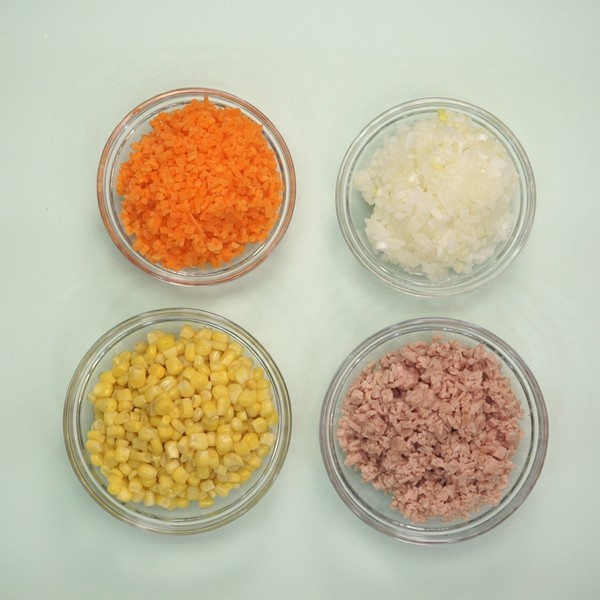 將洋蔥,胡蘿卜,火腿剁碎,玉米罐頭去除水分,備用