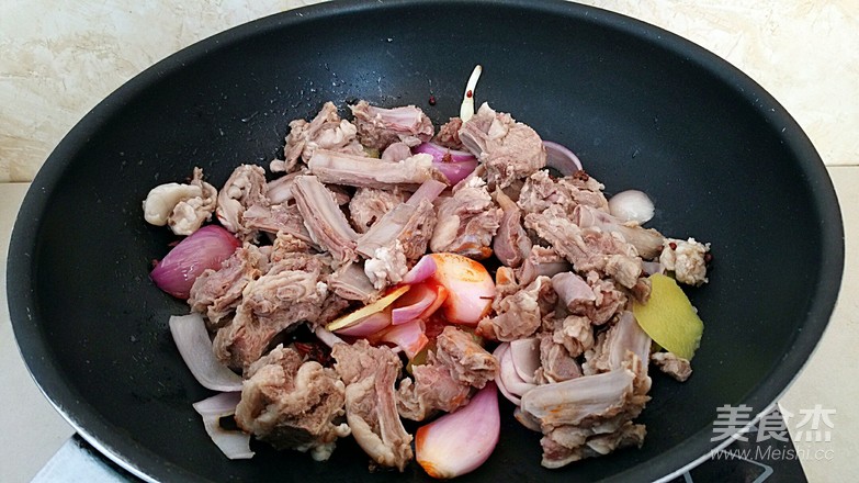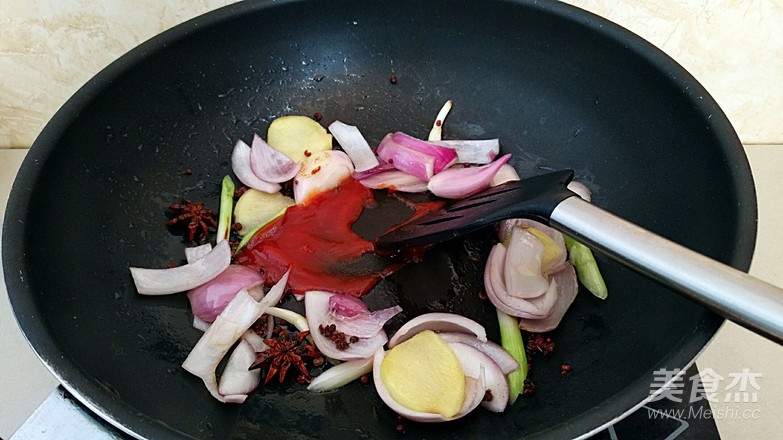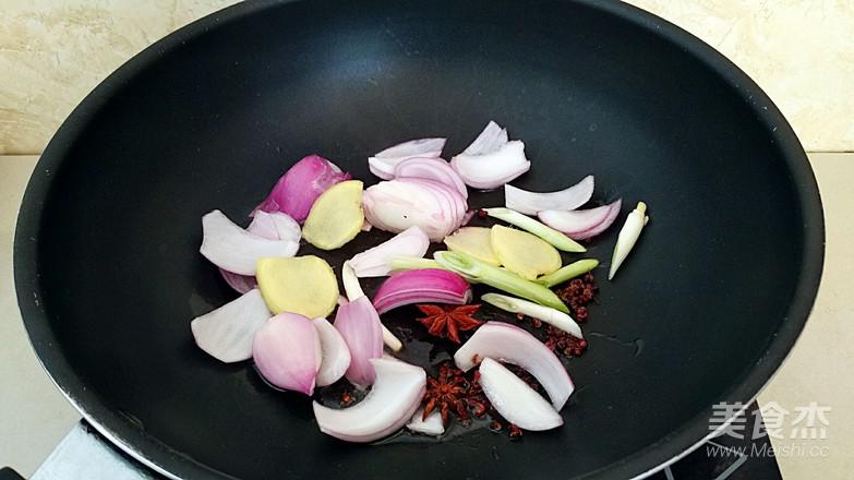 鍋中放油燒熱,放入洋蔥,姜,蔥,花椒粒,八角熗鍋。