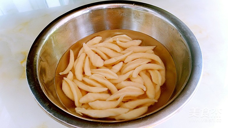 面粉中放入堿1克,鹽2克,涼水適量,揉成較硬性的面團,蓋上保鮮膜醒面三次,揉面三次成光滑的硬性面團。