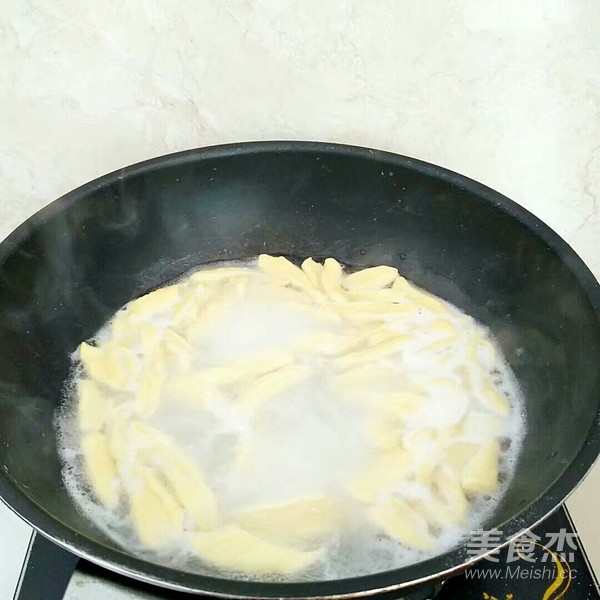 開始制作剪刀面,鍋中水燒至冒泡,用剪刀把面團剪成菱形狀,調(diào)入2克鹽,入鍋煮5分鐘。