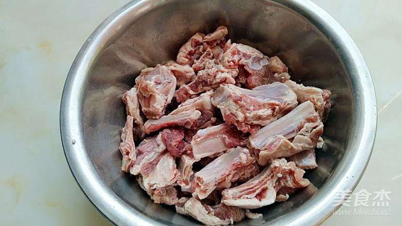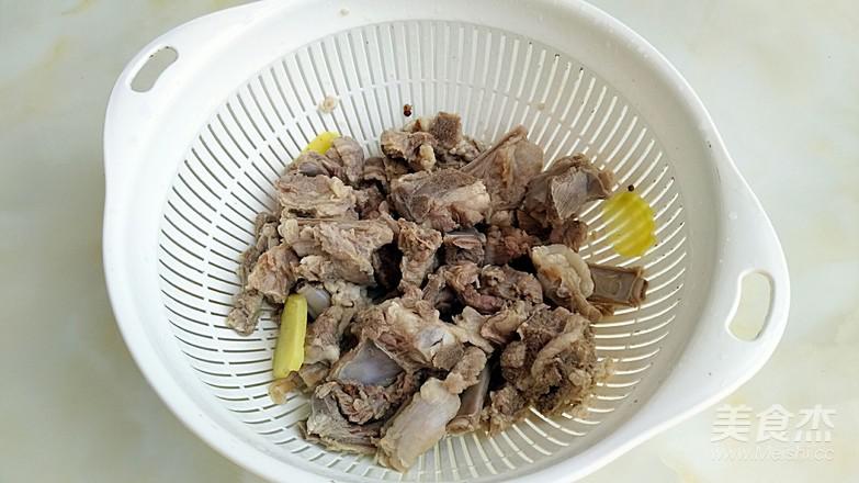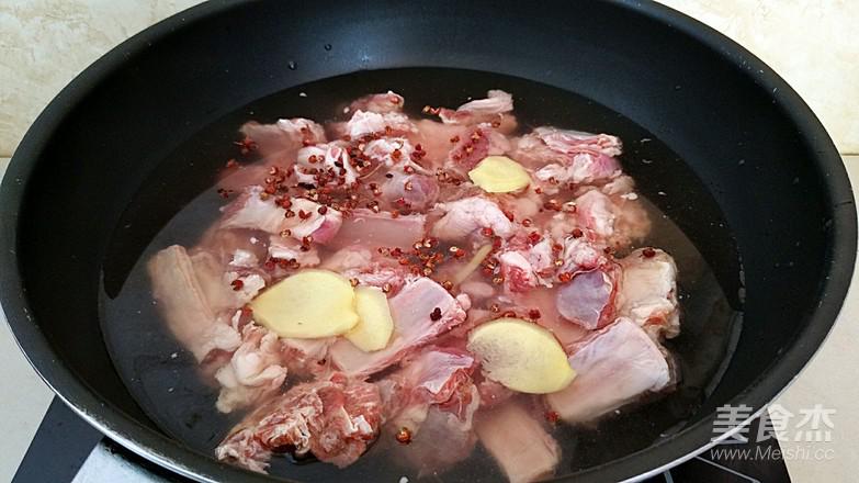 鍋中注入涼水,放入羊排,花椒粒,姜片煮開戳水去除雜質(zhì)。