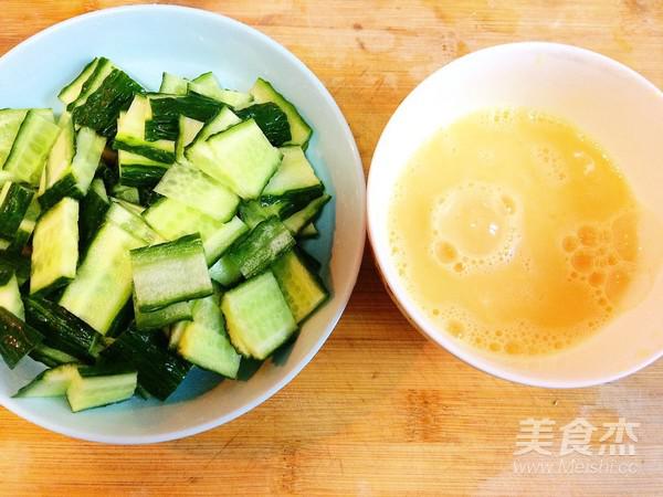 2.黃瓜切斜四方薄片,雞蛋打碎加料酒攪成蛋液