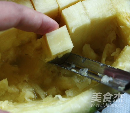 2.菠蘿半個,將表面切成小方塊,切時要深一點,但不要切到皮。