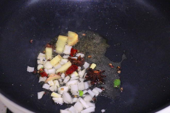 九陽輕奢炒鍋放入少許食用油,油熱后放入干紅辣椒、花椒、八角、姜片和大蔥碎,煸出香味;