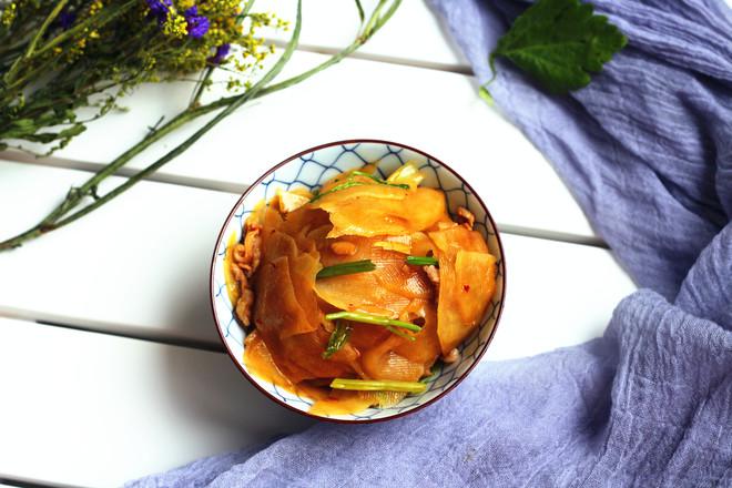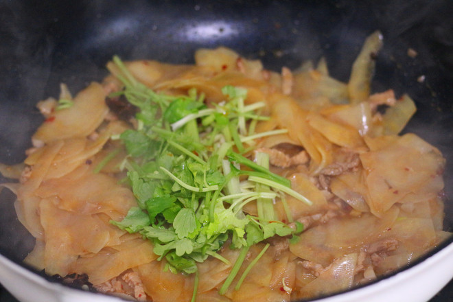肉絲放入沸水中淖一下,洗凈浮沫,控干水分,放入鍋里;