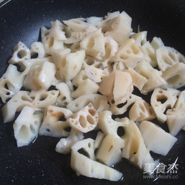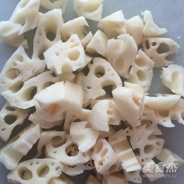 蓮藕開水焯燙3分鐘,撈出瀝去水分備用。