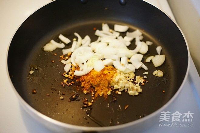 鍋入油,中火燒熱,加入姜蒜沫,切好的洋蔥,咖喱粉和辣椒粉炒一分鐘
