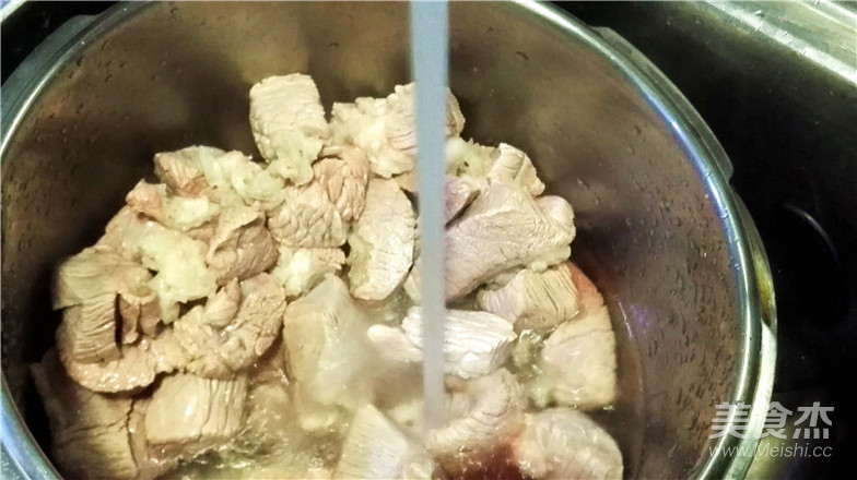 4.焯燙好的牛腩過涼水沖洗干凈;
