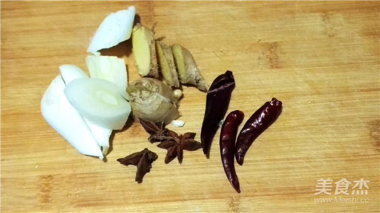 6.鍋中放油,將蔥、紅尖椒、姜片、八角入鍋煸炒;