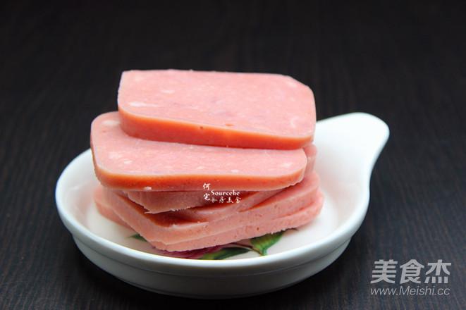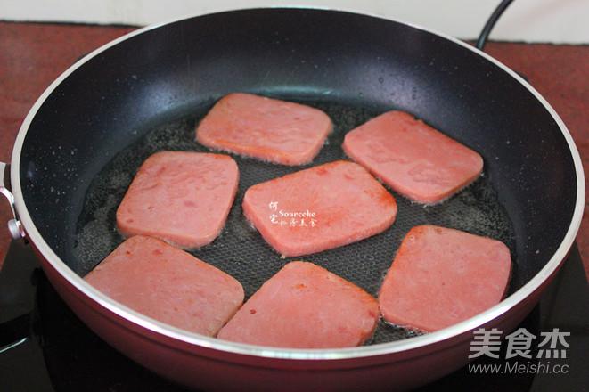 5.熱鍋,倒油,小火煎香火腿,起鍋;