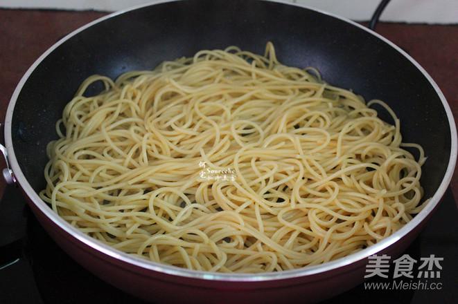 6.鍋中少許油,放入拌過橄欖油的意面,把調(diào)均的雞蛋淋在意面上面