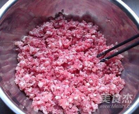 調(diào)肉餡按照一斤肉加兩個(gè)雞蛋的比例,加入鹽、糖、味精拌勻!
