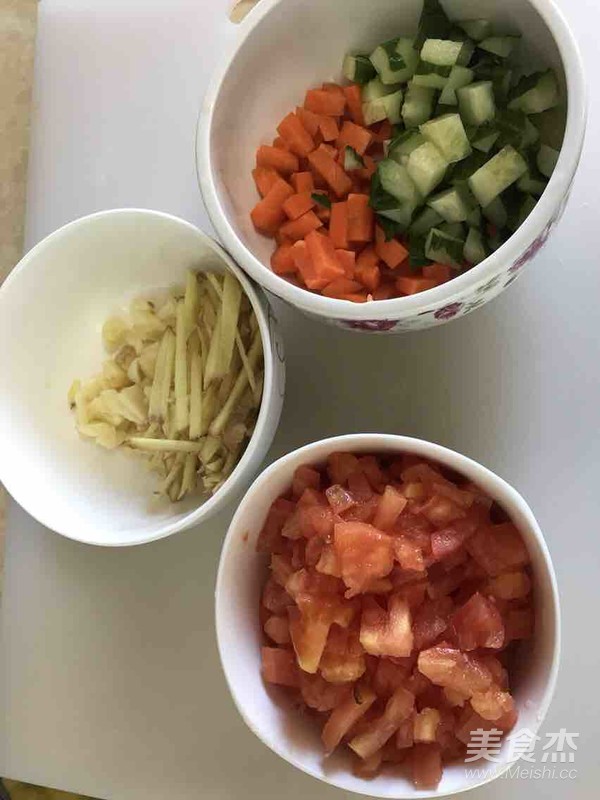 如圖 準備輔料 番茄如果不用水焯去皮的話就盡量切碎一點、這樣汁液比較容易炒出來
