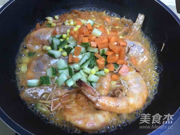 在鍋里繼續翻炒,然后加少量熱水,蓋上蓋子燜到大蝦變形。