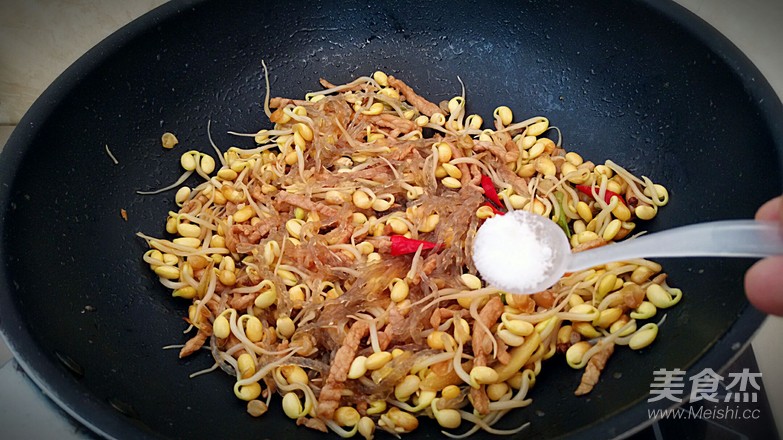 豆芽扒拉四周,中間放入肉絲煸炒變色。