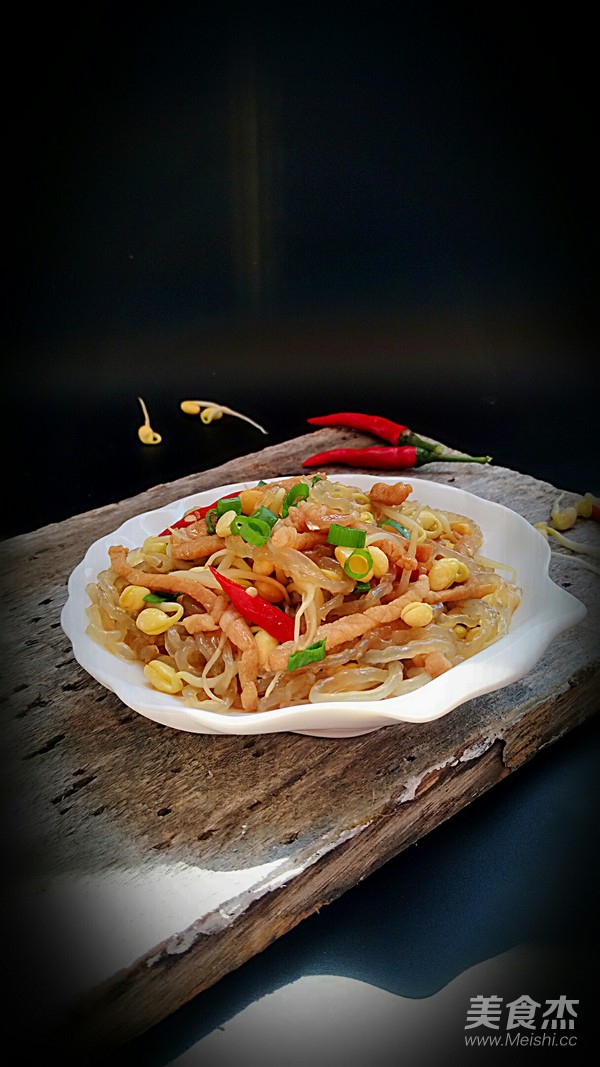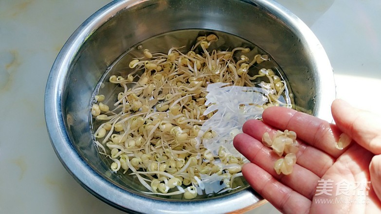 豆芽清水寖泡一會,去掉豆皮。