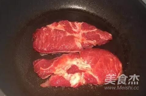 2.第二天從冰箱取出腌好的豬肉。平底鍋,大火熱鍋后,轉中火,豬肉平鋪鍋里兩面煎。