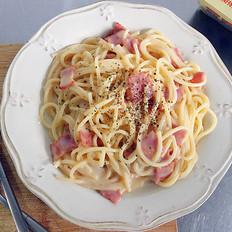 然后將另一鍋里的意大利面撈出加入到這個(gè)鍋里拌勻