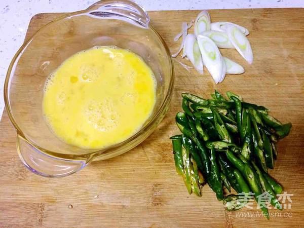雞蛋打散、辣椒斜切成小段、蔥切粗絲;