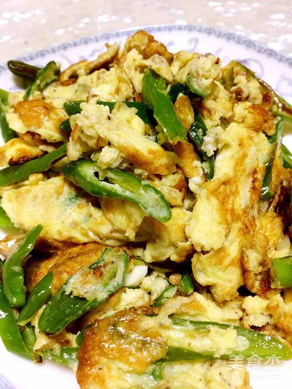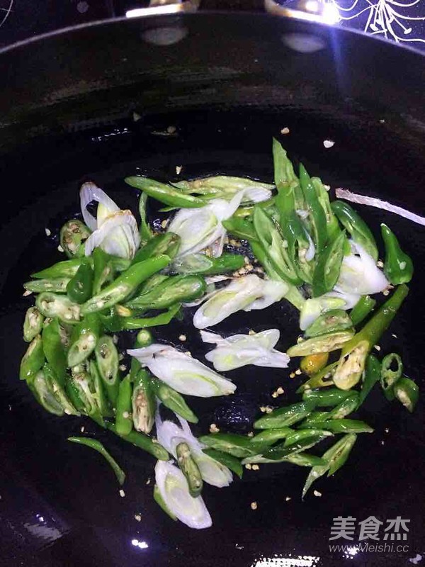 辣椒和蔥一起下鍋,翻炒10秒,加雞蛋液;