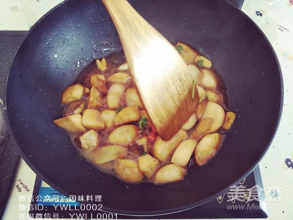 5.倒入醬油、低度白酒(此處不用加水),大火燒開后轉小火,蓋鍋蓋煮至湯汁粘稠,杏鮑菇很容易熟,蓋上蓋燜煮5分鐘。